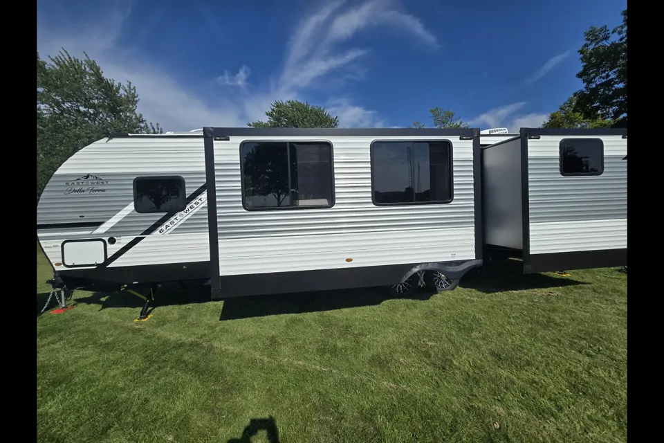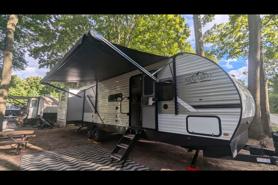 This camper is great for couples or larger families. It's very spacious and has plenty of room if it's cold or rainy weather. The camper has a king size bed in the master bedroom. The couch and table can be used as a bed. The bunk room in the back has 4 bunk beds. There is a small outdoor kitchen with a stove/griddle and mini fridge. The camper will be stocked with plates, bowls, cups, silverware for 10 people, coffee cups, mixing bowls, serving utensils, coffee maker (ground coffee), crockpot, griddle, toaster, pots and pans, outdoor rug. You will need to bring towels and bedding or you can add them on to your reservation for a fee.