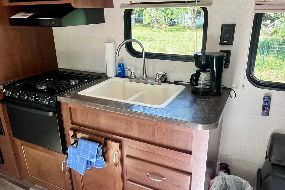 Clean and comfortable RV with queen bed, sleeper sofa, 2 bunks, full bathroom with shower, kitchen with refrigerator, gas stove/oven, microwave, heat and a/c Dishes, linens, coffee pot, 2 flat screen tv’s , stereo are provided. I can deliver only, cannot by towed by anyone else. Will deliver and set up for a fee.