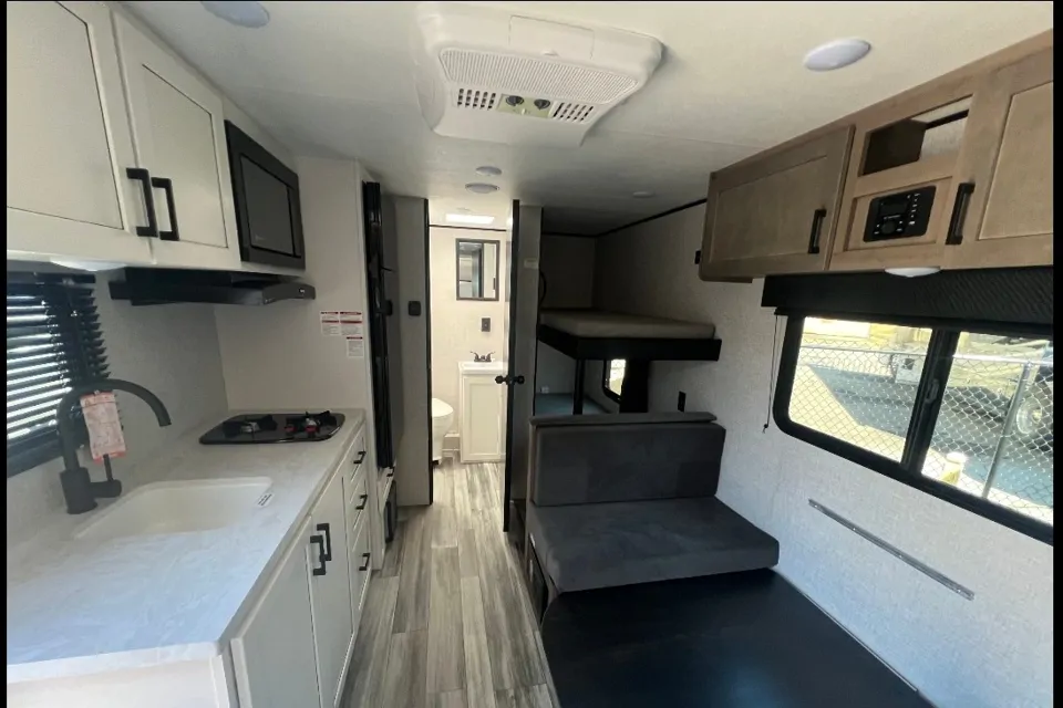 Sleeps up to 5 – Queen bed, bunk beds, and a convertible dinette