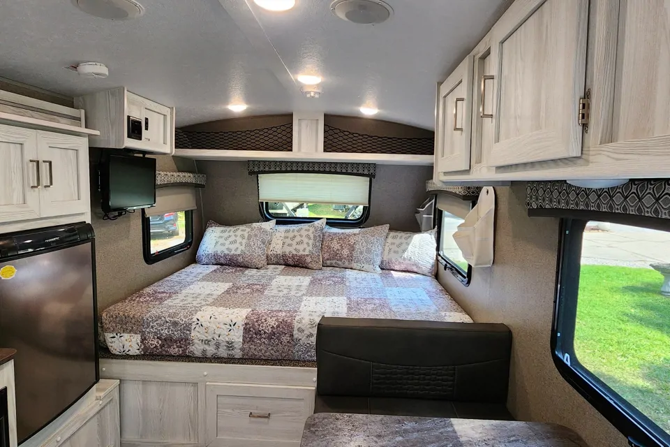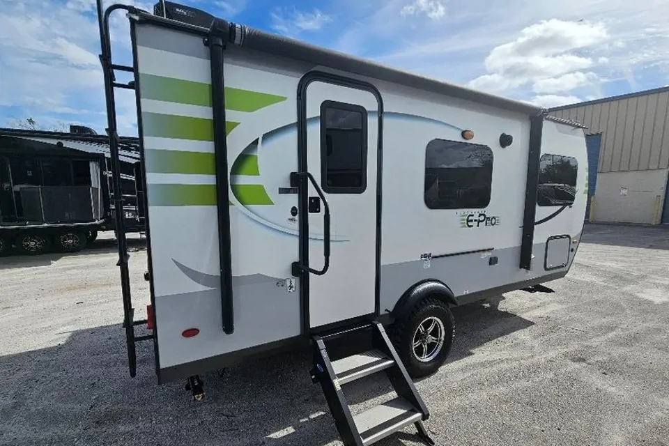 Easy tow. Great for off-grid camping or fitting into small sites. This little E Pro sleeps 3 and packs all the creature comforts in a small footprint of 20 ft. with one slide. There is a comfy queen sized bed and a dinette that converts to a twin size bed so it sleeps 3 comfortably. The kitchen has a fridge/freezer, a three burner stove, a deep kitchen sink, and microwave.
