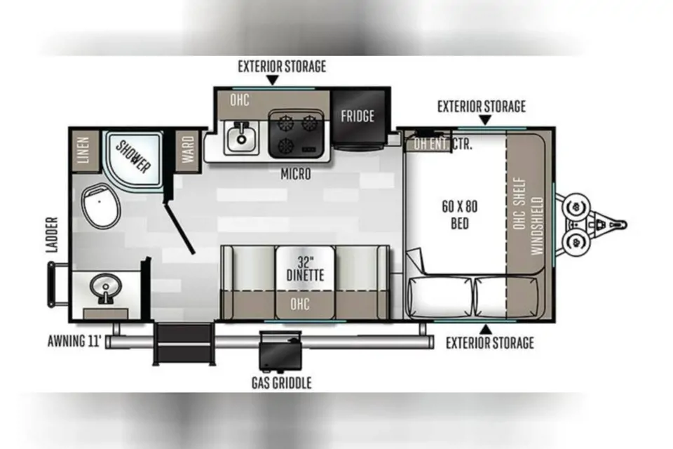 Outside there is a griddle that attaches to the side of the camper to prepare meals in the great outdoors whether it be in the wilderness, or tailgating at the speedway, games or festivals. It has an electric awning to shade you from the sun.