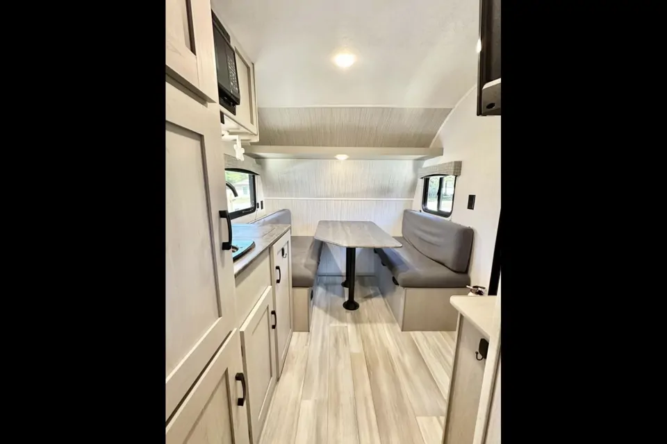 Inside, this camper you will find bunk beds and a dinette the converts into a double bed. Both are large enough for average adults and have memory foam toppers for added comfort . Fresh linens, pillows & blankets provided.