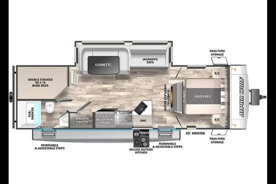 Welcome to our beautiful 2023 Forest River Alpha Wolf 26DBH-L travel trailer! This will be a total GLAMPing (glamorous camping!) experience for you with so much included in your stay. Think Airbnb RV at your service.