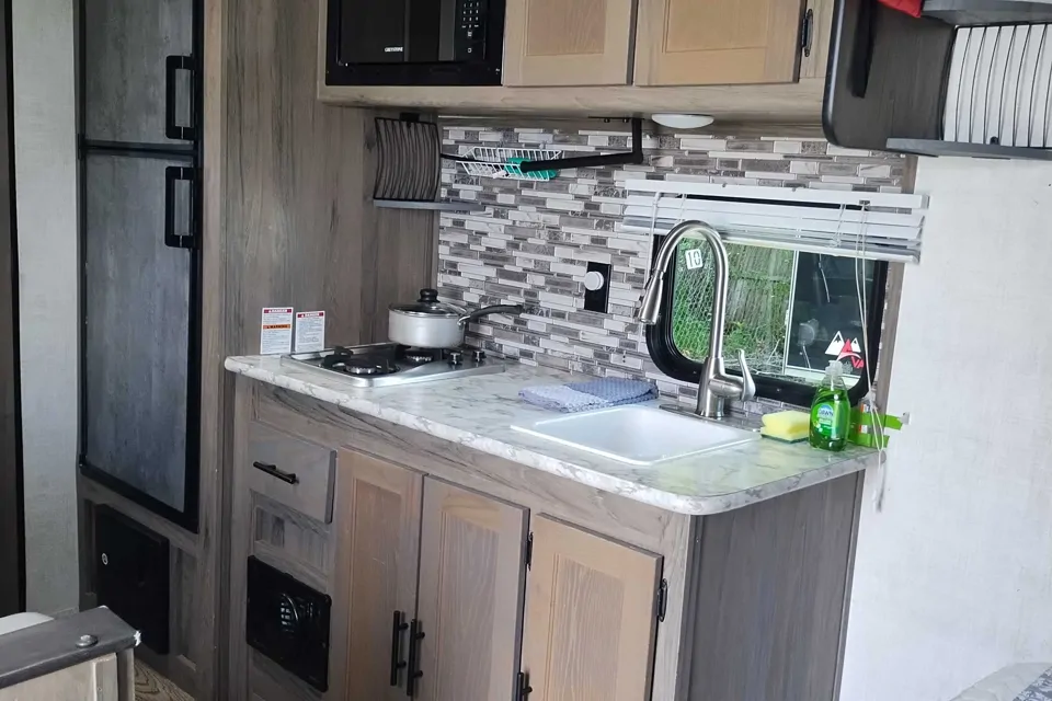 17-foot living area. Perfect for a couple, Plenty of space in the bathroom, bath tub with shower, Everything included linens to kitchen utensils. Pets need a vacation, so dont forget to bring the dog. It's a small, spacious for a small camper, wonderful, beautiful space to spend time.