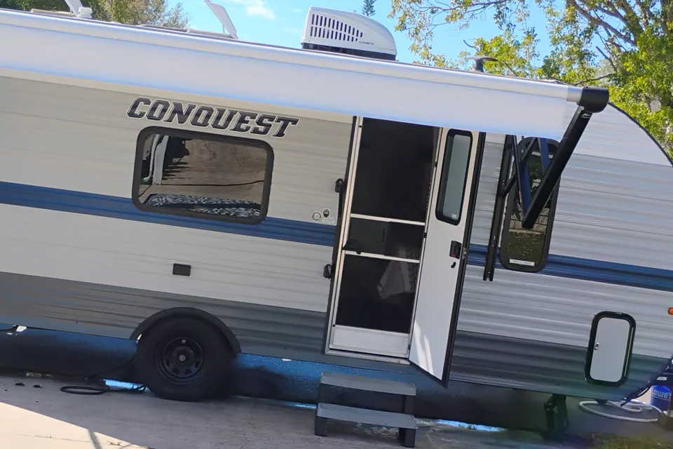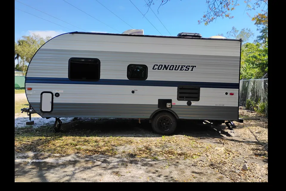 Gulfstream 20 foot. queen size bed very comfortable residential quality. TV with fire stick just need Internet Fully equipped kitchen, sink frig freezer microwave dinnette with bench seat and 2 stools all cooking utensils dishes full bath tub and shower toilet all bed and bath linens pets allowed with respectful owners