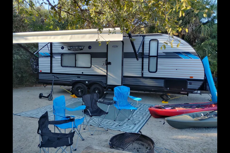The outside comes with four folding chairs a outdoor mat and a tabletop griddle with propane, electric tung jack and 4 leveling jacks. also available is a bike rack for four bikes or just a cargo rack. There's three 10-ft kayaks and two 6 ft children kayaks available with paddles and life jackets to rent for great water adventures. also available is quiet generator for rent for those off-grid camping excursions.