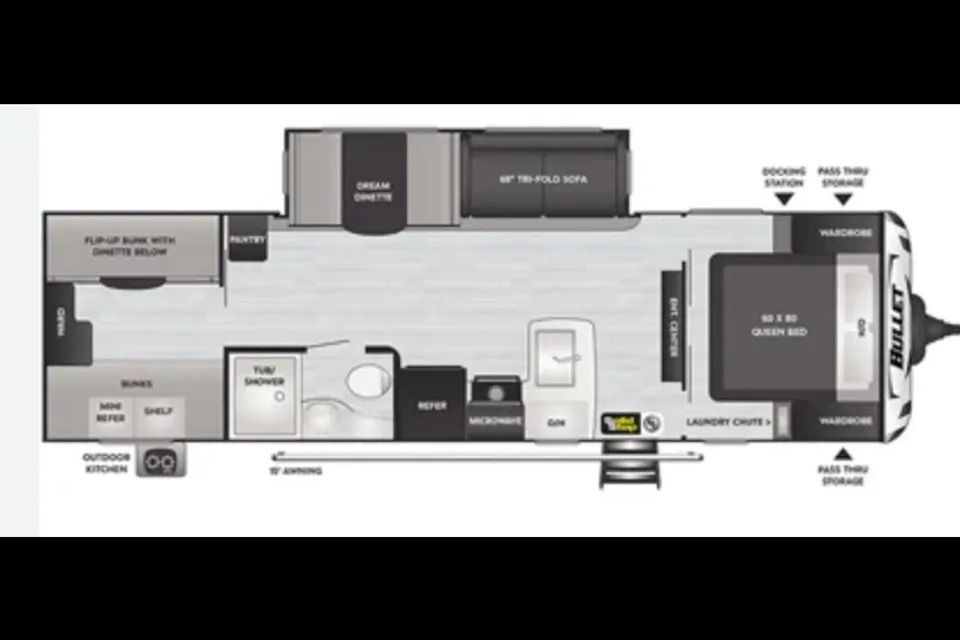 Exterior: 15' Power Awning with LED lights, Power Stabilizer Jacks, Outdoor Speakers/Stereo.