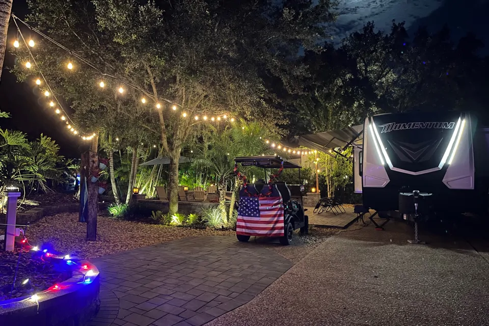 Electric awning, Outdoor speakers, Plenty of storage for gear and supplies, two zero gravity outdoor chairs.