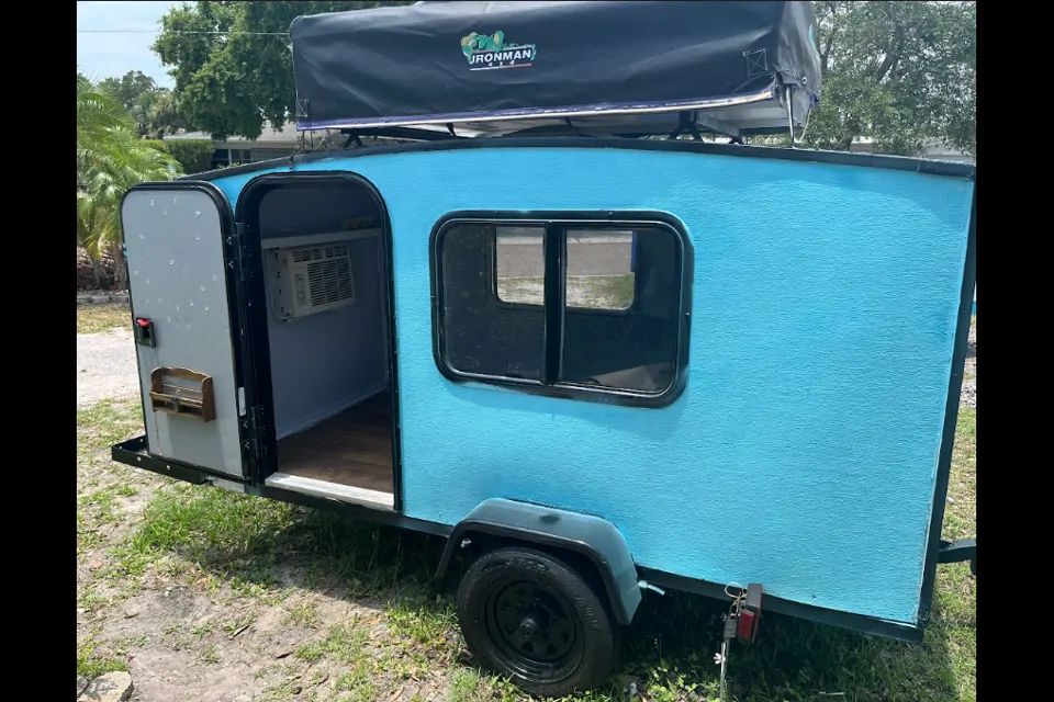 Tranquility on Wheels with a serene aqua blue with black trim. You can sleep inside, on top with the Pop Up Tent, or use the Trailer to haul your Camping Gear for the family. Open cargo interior that you can put a foam mattress inside.