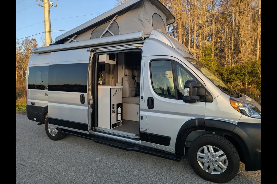 Lateral arm power patio awning and Thule bike rack on the rear door to help you transport mountain bikes.