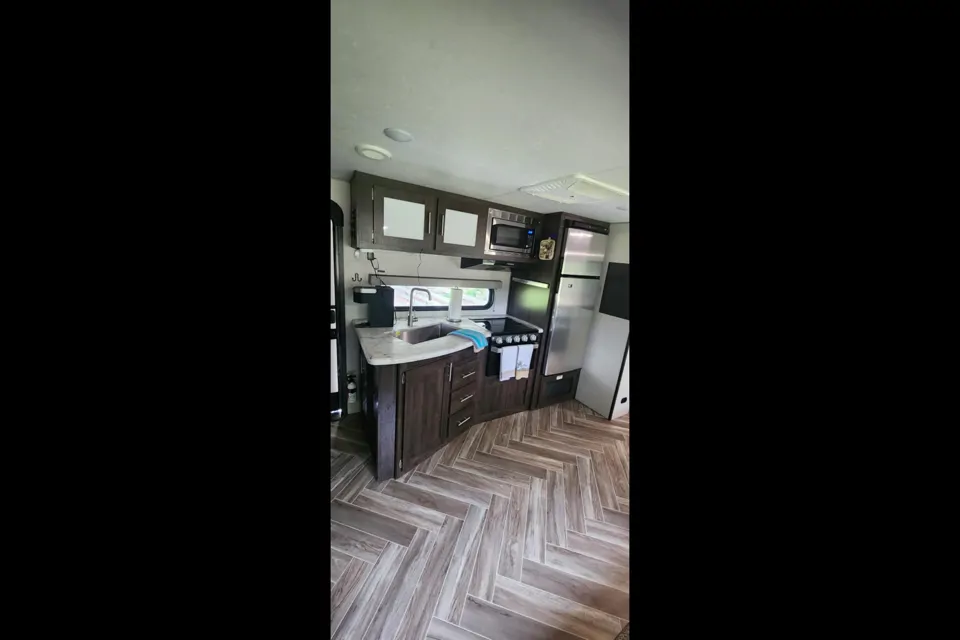 This Camper is great for a lot of people. Queen master bed. Bunks two are twin and the other two are 25 inches wide. Jackknife sofa. Comes loaded to camp. All bedding and towels. Pots and pans. Dishes. Paper plates and bowls. Keurig. Electric frying pan. Airfryer. You only need bath soap. Condiments and soap. The out door kitchen has a fridge and gas griddle. Also has a pit boss companion pellet grill. 2 full length mats and chairs.