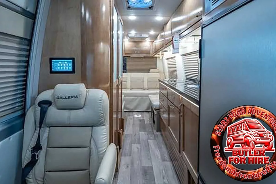 This luxury Class B RV measures approximately 24 feet 3 inches in length. The Galleria RV features a power armless awning with wind sensing & LED lighting, rear screen/shade, Truma Combi Furnace/Water heater, macerator, convection microwave, Fantastic Fan with rain sensor, low profile A/C, solid surface counter top, LED TV, back up camera, LED lighting, solar panel, USB ports, ground effect lighting, Li3 Lithium Battery System with 600amp Lithionics Lithium battery, sofa rear seating, triple captains seats, the electronics package, and a side entry screen door. Comfortably sleeps 2 adults and a small child.
