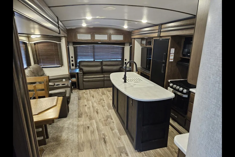2021 Keystone Cougar 32 RLI, 3 slides, 2 exterior awnings, awnings over slide tops, auto leveling, 50-inch big screen, entertainment system with outside speakers, fireplace, double recliners, dinette set, island kitchen, double stainless steel sink, 2 30 gallon propane tanks, outside lighting, outside tv/entertainment hook-up, !/2 ton can be hauled by most 1/2 on trucks. King size bed with large closet and wardrobe for clothing. Trailer hitch and stabilizers are available for use if needed. Only used twice since new, always stored undercover
