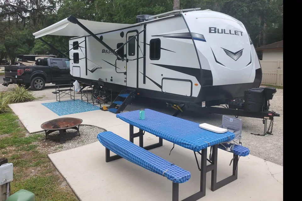 Packed and Ready for 10! Comes with everything you need including bedding for 10 people. Has all kitchen necessities to cook inside or outside! 2 AC units. Private bunk room with 4 bunks or 3 and a dinette. Private Master with Queen Short Bed. Solar charges batteries which power refridgerator, freezer and basic lights. Generator available to rent if full hookups not available. Includes all items needed except your clothes, shoes, hygiene items! From beaches, mountains, events, music festivals or anywhere, it’s perfect! We can deliver and setup for you also! Looking for trip recommendations? Just ask! We are a military family who loves to travel when time allows. Happy Camping!