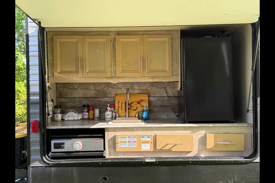 Inside, the expansive slide-out creates an open-concept living space enhanced by modern finishes, elegant cabinetry, and inviting seating. The fully appointed kitchen mirrors the convenience of home, featuring premium appliances, generous counter space, and a seamless flow for cooking and entertaining.