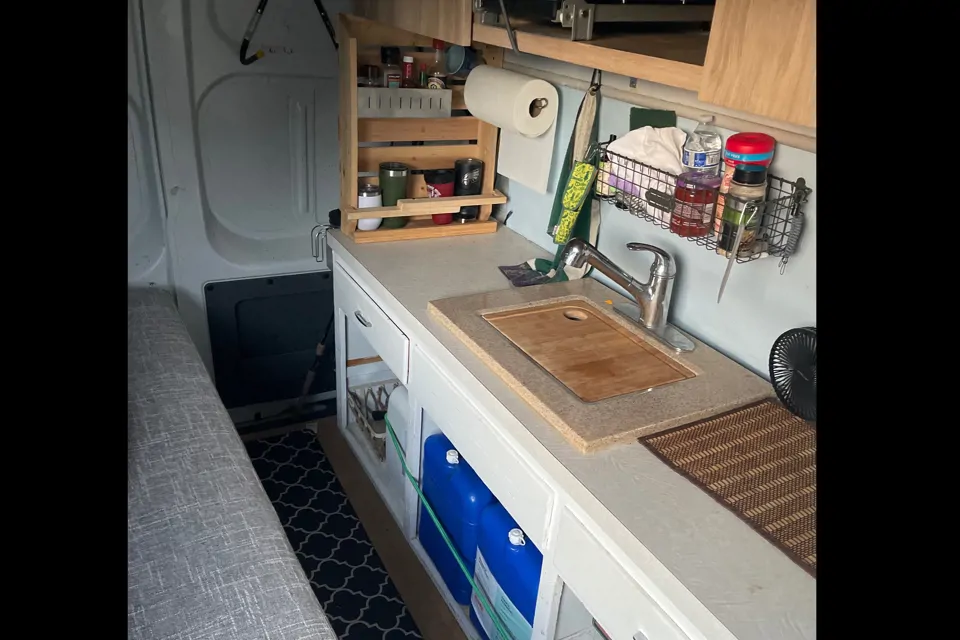 Sink with hot and cold, water and fresh and gray tanks, power station, couch/convertible bed very comfortable, porta potty , plenty of additional equipment available as part of rental like tables, generator , hitch cargo rack, grills and cooking supplies, etc .