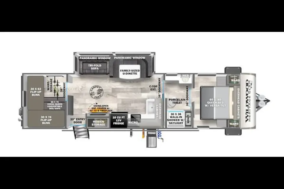 You'll get space, comfort and privacy - This Trailer comfortably sleeps up to 8 adults with a private queen master bedroom, a private bunk room featuring two flip-up bunks and a sofa that converts to a queen bed, plus a jackknife sofa that sleeps two.