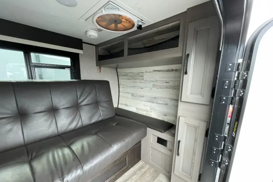 Our compact camper offers effortless towing and convenient functionality, featuring a versatile sofa bed that seamlessly converts into a comfortable seating area or sleeping quarters. Ample storage space is provided adjacent to and above the couch, while a cleverly designed USB outlet ensures devices remain charged. The camper is equipped with a television and air conditioning unit. A rear door pops up and grants access to the refrigerator and kitchen storage compartments, making it an ideal setup for couples or solo adventurers! It’s a super fun way to hitch up and go!