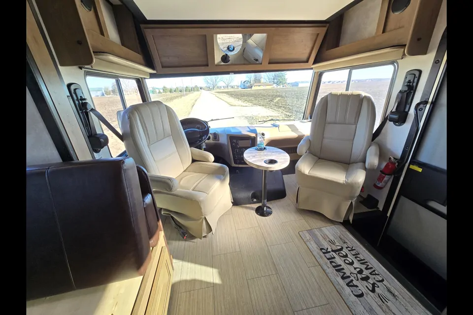 Driving The Defiant is a pleasure, thanks to the amazingly comfortable captain’s chairs for the driver and passenger, which swivel 180 degrees for added convenience. The vehicle features two slide-outs, providing ample space for everyone to move around comfortably. An aftermarket stabilizer enhances steering, ensuring a smooth and stable ride.