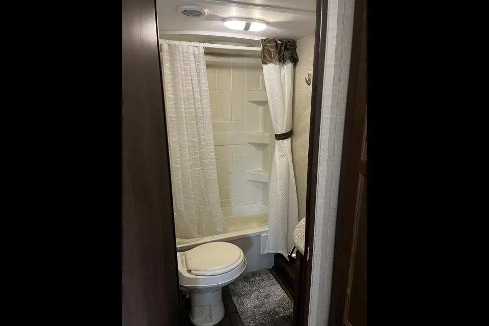 This model offers a slid out for extra space. An outdoor shower for messy days. An outdoor kitchen with space to enjoy cooking outdoors.