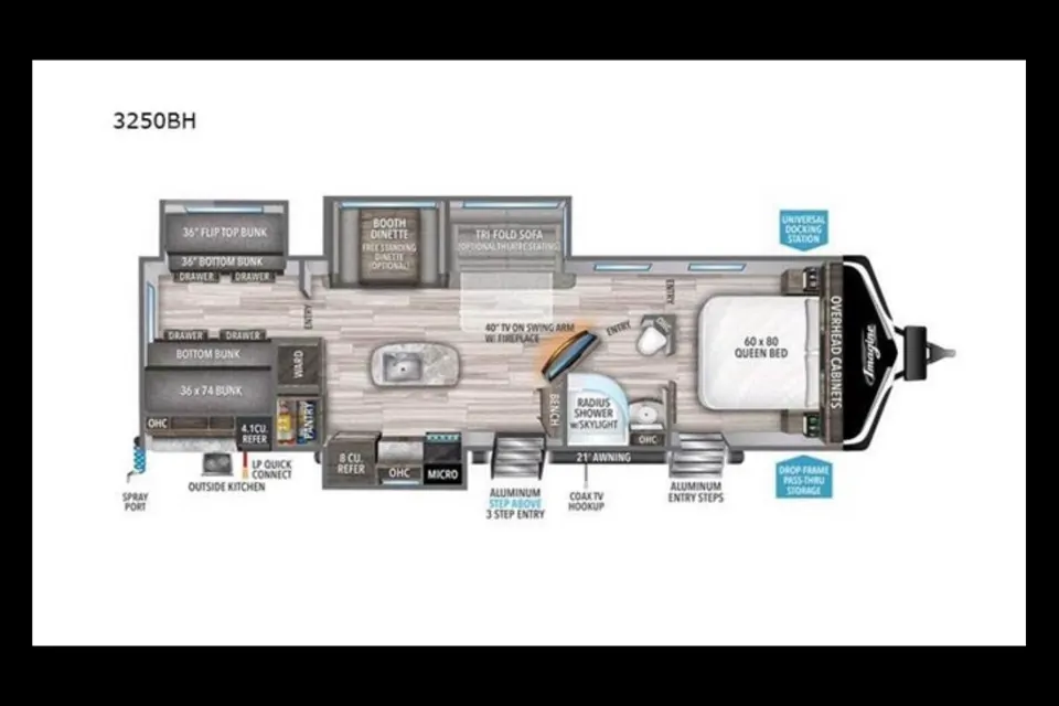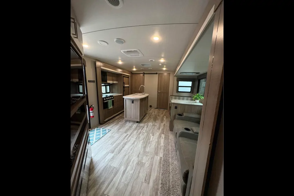 Great rv for all your family vacations. Features wide open spacious main area with an island for lots of prep area and heated reclining lounging chairs, tv and even electric fireplace for those cooler nights. Bunk area for the kids with additional tv for some down time after a long day at the beach. Outdoor kitchen and bar with 22’ awning to give you shade on hot days.
