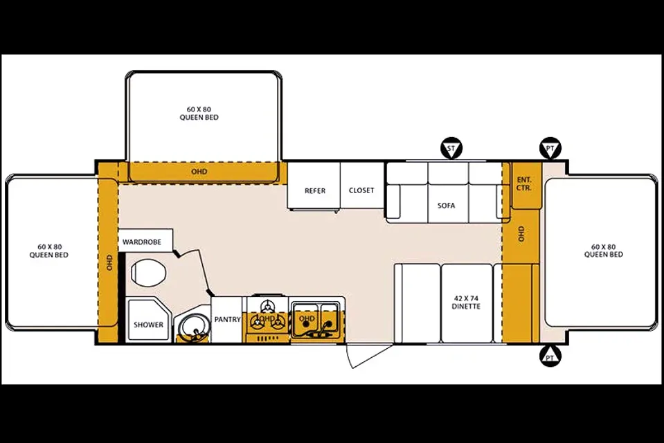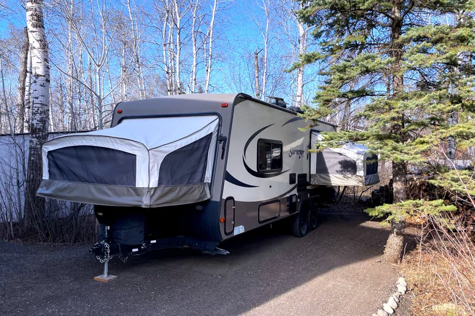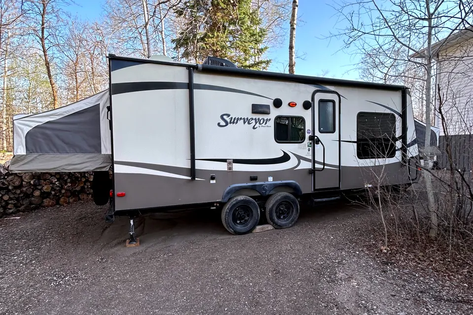 Hybrid Camper Model 224T - 2016 Forest River Surveyor. 24'9" in length. Like new condition. Pulls beautifully. Sleeps 10 with 3 queen tilt-out beds, fold down couch and the dinette. AC, water heater, outside and inside shower, heater, fridge, freezer, 3 burner stove, oven, microwave, range, bathroom fan. GVWR of 5416 lbs with over 1000 lbs lots of cargo capacity. Lots of storage. Sets ups with ease using the power tongue jack and power awning with led lights. All original manuals included.