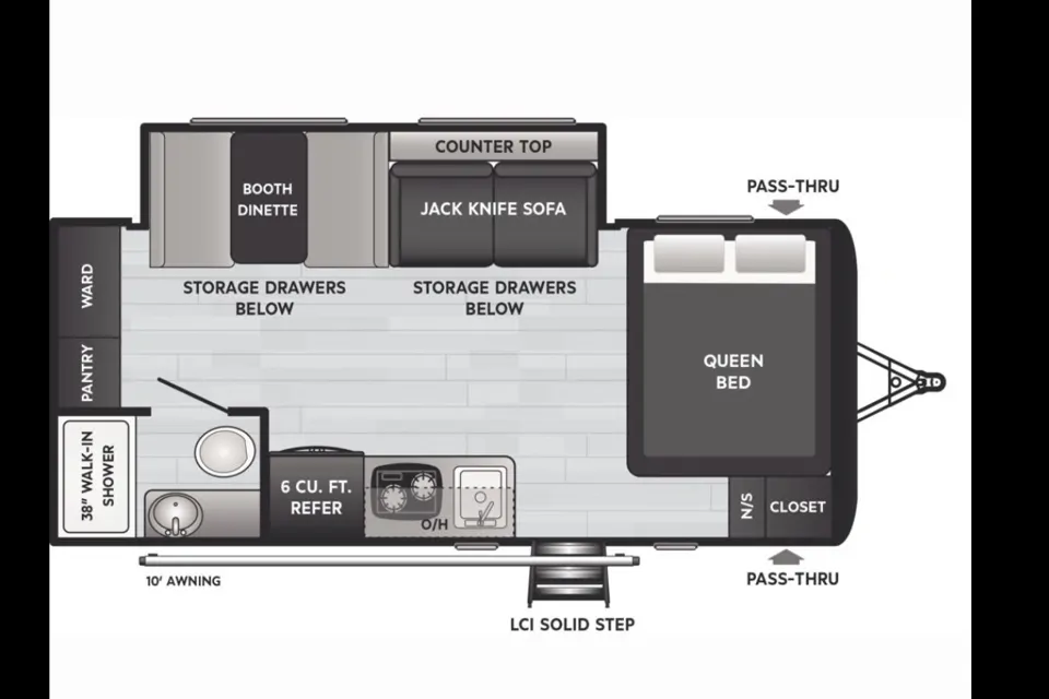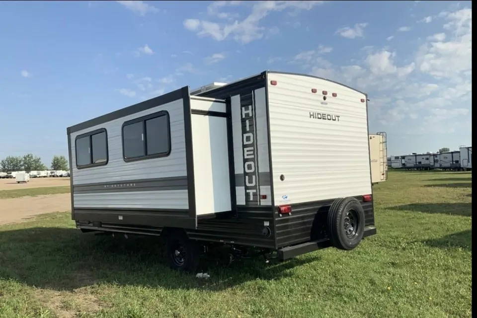 This travel trailer also includes a two burner range with exhaust fan, propane hot water tank, gas furnace, electric fridge, full bathroom with a shower, extra hot and cold water outside for cleaning, bathroom fan, smoke detector. One full propane tank avail with rental. Beddings and linens not included.