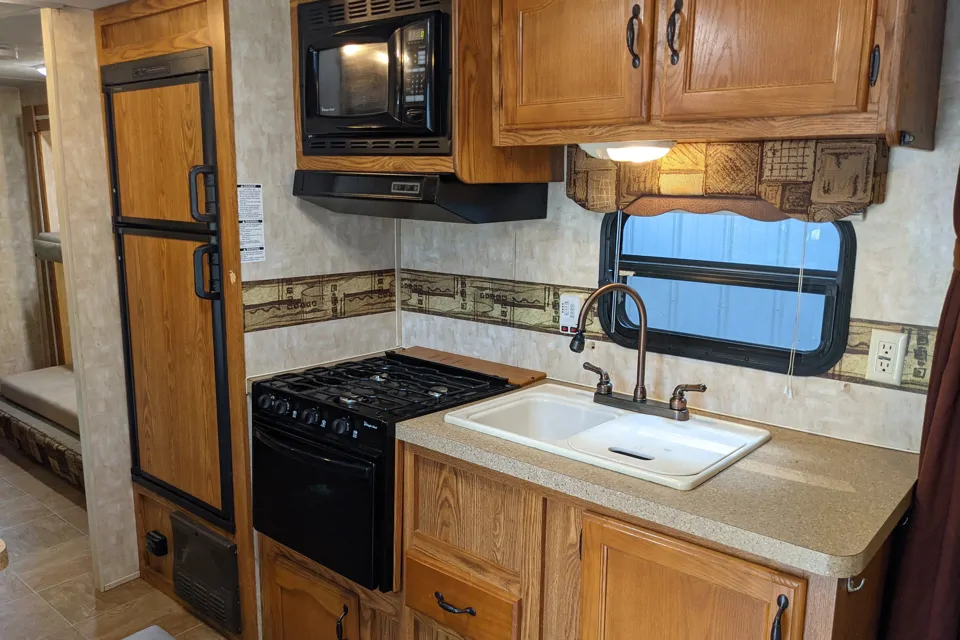 Perfect for a couple or small family and easy to tow and setup. 4700 lb weight. Twenty-five feet in length with one slide out. Queen bed with foam topper up front with one set of bunks in the slide out toward the back. Dinette also converts to a bed. Sleeps 6, but I think 4 would be best. Some recent updates and led lighting.