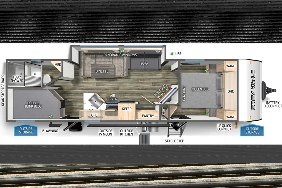Step inside and you’ll find a modern interior with all the comforts of home. The master bedroom features a cozy queen-sized bed, while the bunkhouse boasts double-sized bunks that are perfect for kids or extra guests. The dinette and sofa both convert into additional sleeping areas, ensuring everyone has a comfortable place to rest.