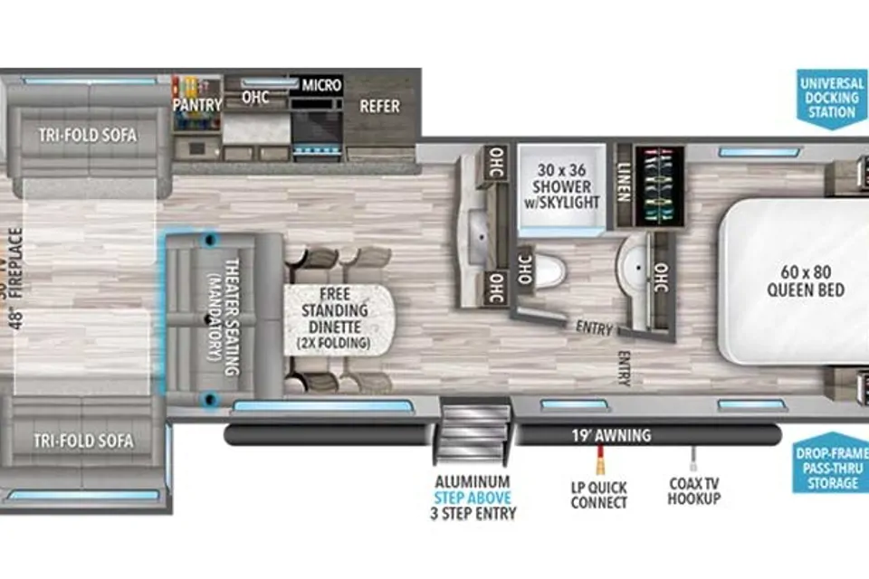 Boondocking is no problem with a 52 gal fresh, 90 gal gray and 45 gal waste tank. It features dual opposing slides in the rear living area for an open space. The two tri-fold sofas will be the perfect sleeping space for your guests or the kids and the Reclining Heated and Massage theater seating is directly across from the 50" TV and fireplace. Prepare all your meals on the three burner cooktop or in the stainless steel microwave. The free-standing table will allow you to dine like you do at home with four padded chairs. This model features a full bath with a linen closet and a skylight. The front private bedroom features a queen bed with a pillow top mattress that will ensure you get a great night's sleep for your next day of adventure with this Easy To Tow Package!