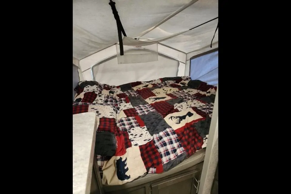 Rockwood roo built by the Omish very well-made family friendly very well stocked sheets pillows blankets towels pots and pans dishes cups spices extra foam mattress for each end and 2 very comfortable recliners