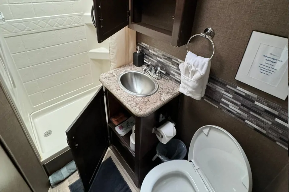 Experience the joy of RV travel with the convenience of your own private bath, foot flush toilet, hot/cold shower, and stainless steel wash sink. Extra storage in the medicine cabinet and underneath the sink. Includes hand soap, bath rug, and toilet paper.