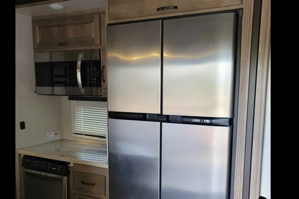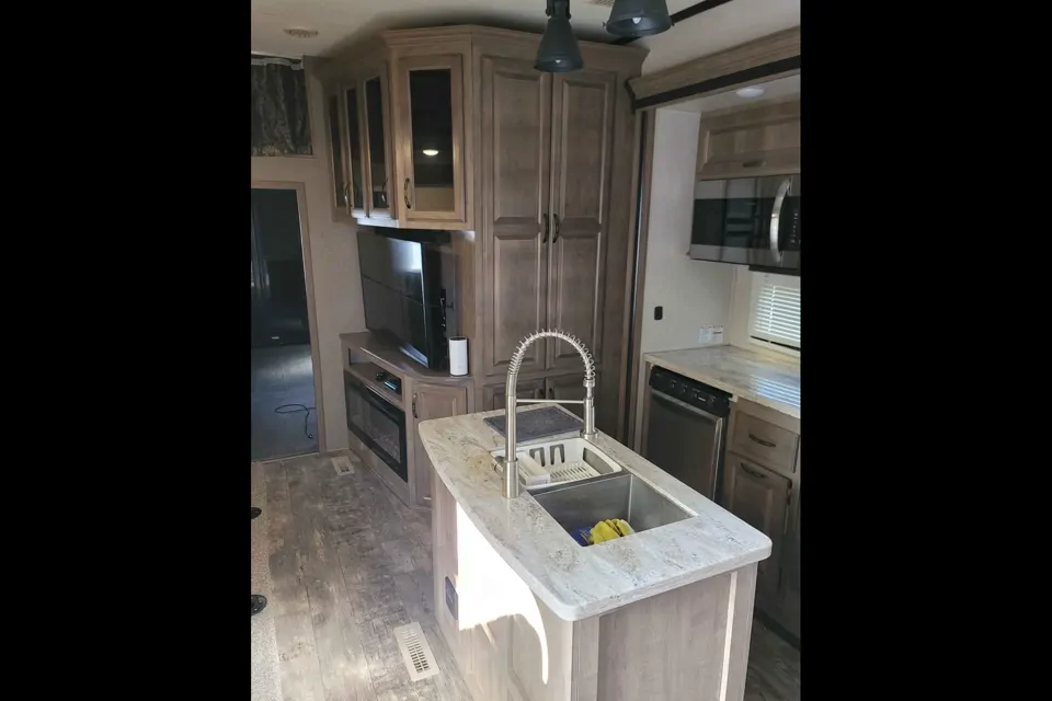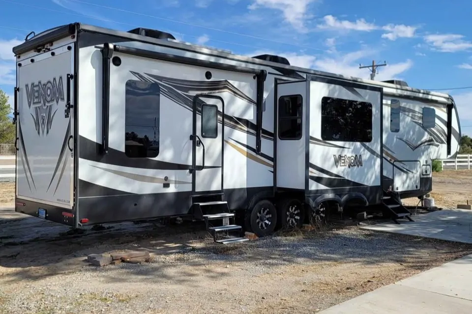 This Toyhauler has a half bathroom in the garage. The back ramp has a railing so that the ramp can be used for a deck. It also has a loft for more sleeping people. Tires are 2 year new. Toyhauler has a separate garage. The garage depth is 12’. Toyhauler comes with 3 TVs.