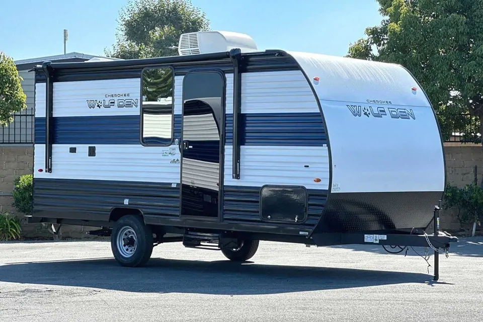 21’9” travel trailer. This all-electric Cherokee Wolf Den travel trailer has exactly what you need to enjoy a weekend excursion and more! Enter to find a queen bed up front and a set of bunk beds in back. A dinette with table is perfect for meals or gathering for a game of cards. It can also be transformed if you have extra overnight guests. The rear corner bath features a tub/shower and toilet for privacy. You will also find ample storage throughout with overhead cabinets, outside storage, a large shelf across the front, plus shelves just outside the bathroom door for kitchen equipment and pantry items, On the outside, a 12' awning for when you want to enjoy a little outdoor living space protected from the elements. Air conditioning and fireplace, perfect for spring, summer and fall use. Lightweight and easy to tow. Many amenities included and numerous add-on options to optimize your trip.