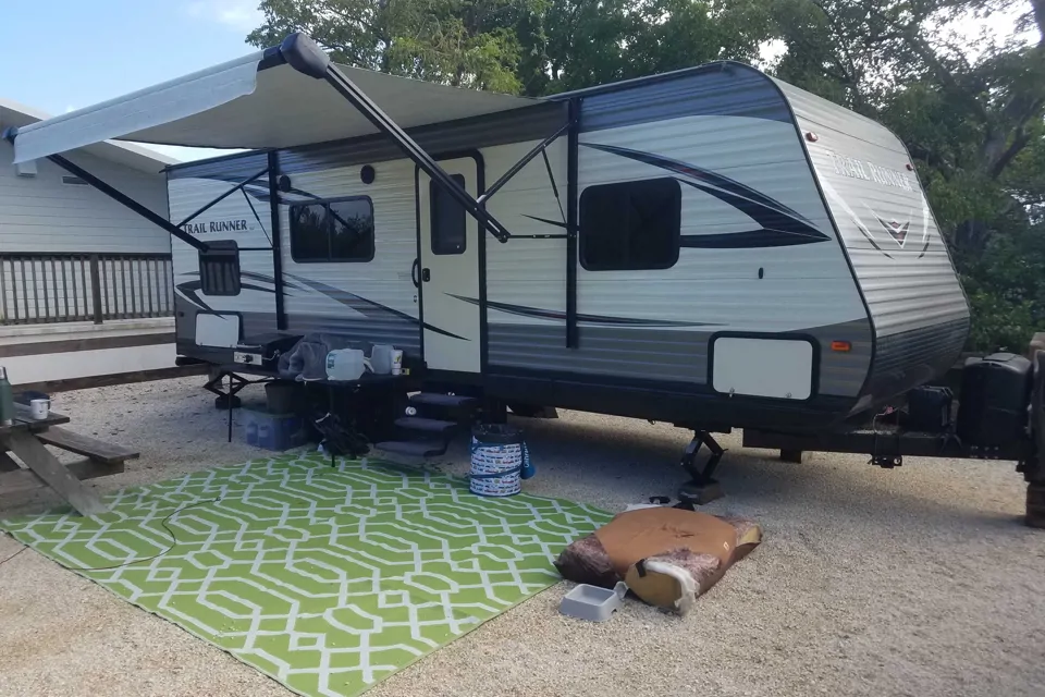 This beautiful travel trailer sleeps up to 8 people and is just under 30 feet long. Heat and air conditioning are available to make your stay comfortable. Trailer has Bluetooth radio with indoor/outdoor speakers and an awning with LED lighting outside. The trailer has a refrigerator, freezer, microwave, oven, stove, and one full bathroom. The following is included with your stay: