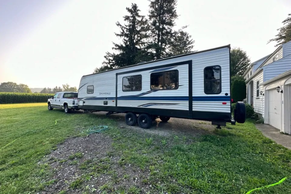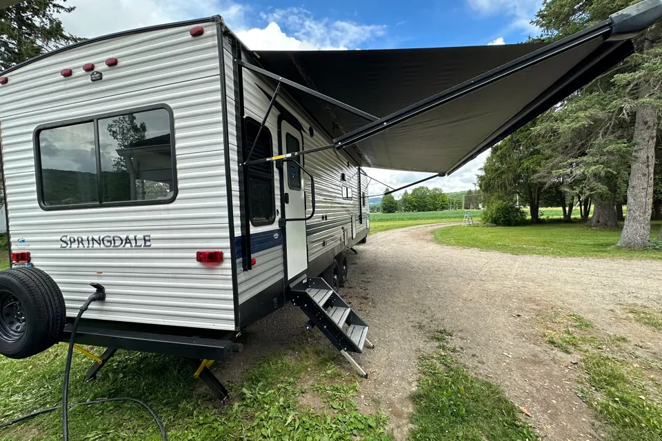 Luxurious 32-feet long travel trailer with lots of comforts and storage, can sleep confortably 4 people or 6 with children (+1 baby/toddler with pack n play included). Full equiped kitchen, dinette table, couch and 2 chairs, TV, Electric fireplace in the living room. Queen bed and Tv in the bedroom.