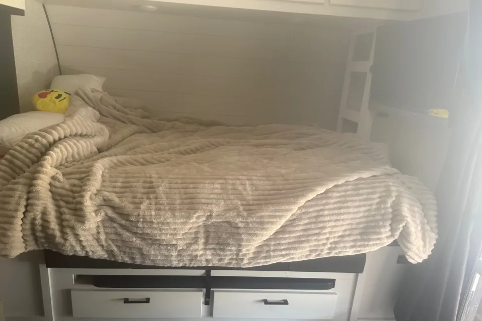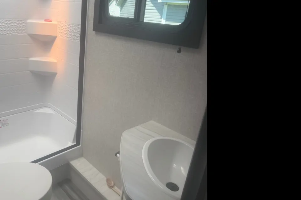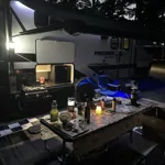 My rv good for off site camping lights surround the camper has a outside propane grill tv can be connected outside extra storage on the roof and solar panel as has a waterless water heater