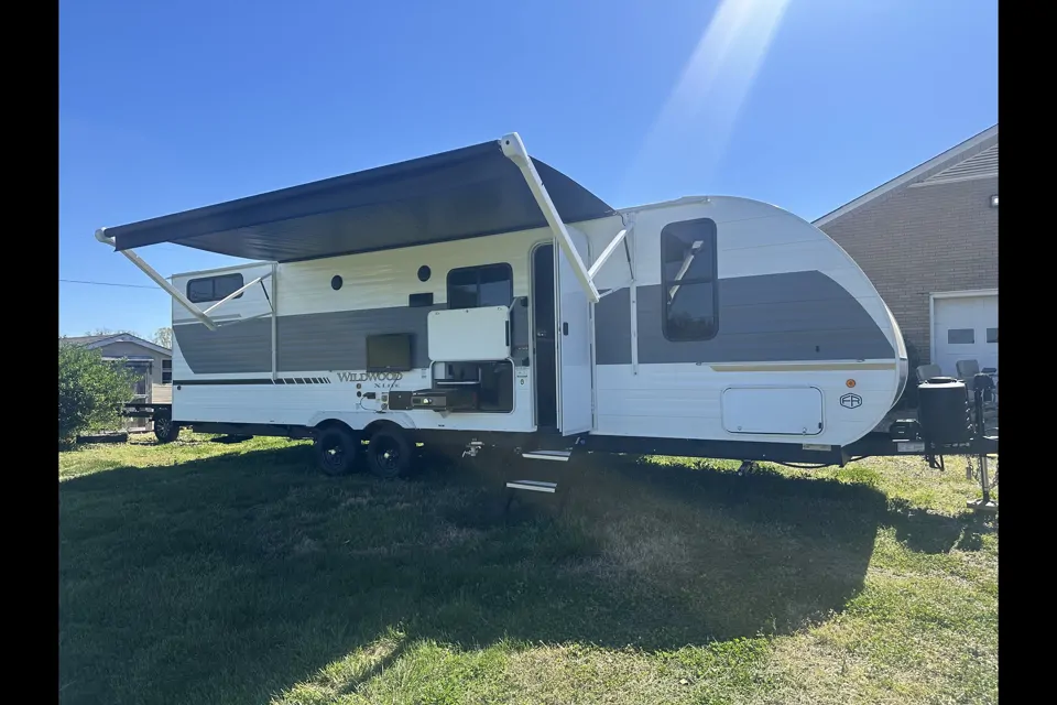2026 Forest River 28VBXL Wildwood X-Lite is a versatile, family-friendly travel trailer featuring a private rear bunkhouse a front bedroom with a custom king Versa-Tilt bed, a U-shaped dinette, a Versa-Lounge, and a full bathroom, sleeping up to 9-10 people comfortably, plus modern amenities like LED lighting, an entertainment center with fireplace, panoramic windows, an exterior camp kitchen, and features for half-ton towing. great for family’s and groups for racing events, camp grounds, or for adding extra room at the house for holidays.