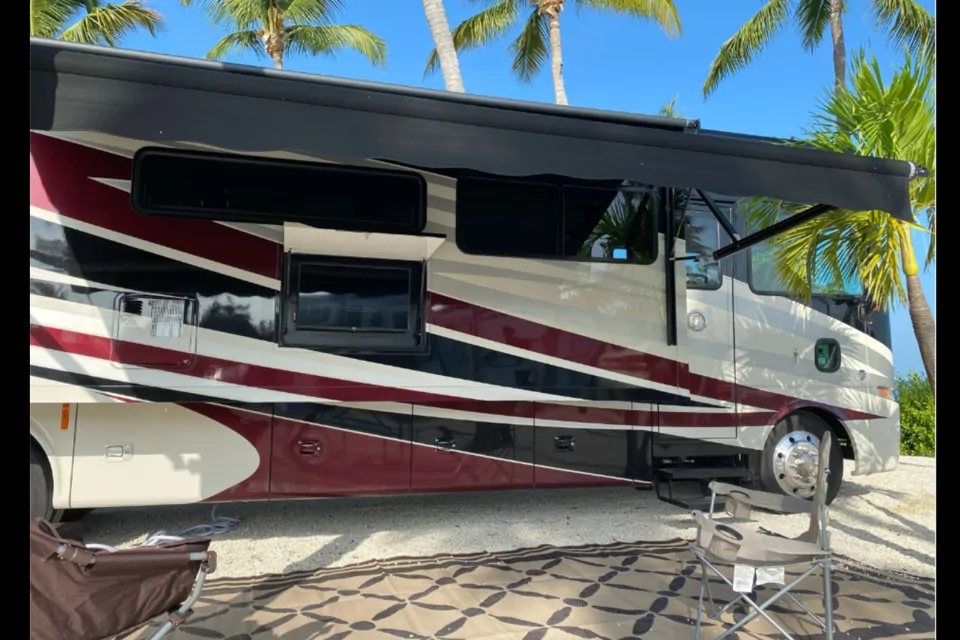 This 36Ft., class A, RV is super easy to drive with its cruise control settings. Sitting above the rest, on a Ford chassis, with a very large windshield for great visibility. 3 cameras for easy parking are displayed on the dash. Automatic electric leveling system that makes setting up a breeze. The interior is fully equipped with a conversion table bed, futon sofa, & an overhead bunk bed. As you enter the rear bedroom you will see an upgraded comfortable rear Queen-sized mattress with nightstands & overhead cabinets for plenty of closets and drawer storage. Equipped with a washer & dryer. Between the closets you have a 32” Led flat screen TV. The kitchen offers an all in one cooktop & oven, convection microwave, refrigerator/ freezer, overhead cabinets for dishes, a double sink, with a pull-out pantry and tons of storage inside an out.