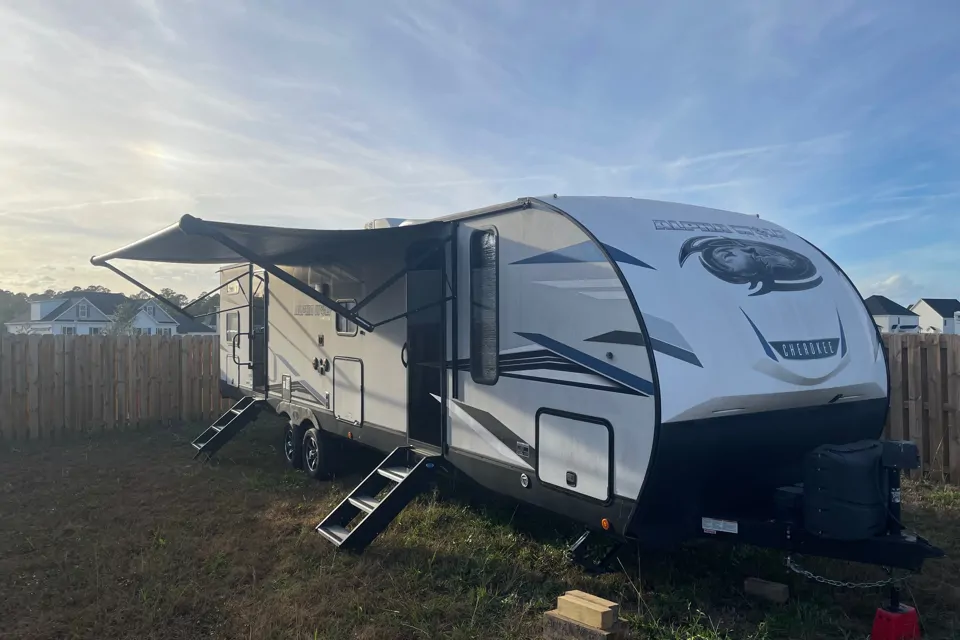 Also includes 5 heavy duty bunks for stabilizing jacks and main e-z jack, 30/50 amp pull and surge protector, sewage hoses, fresh water hook up, outdoor shower, and trailer hitch w/ stabilizer arms.