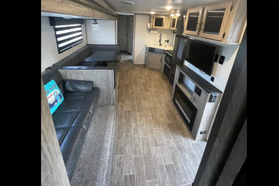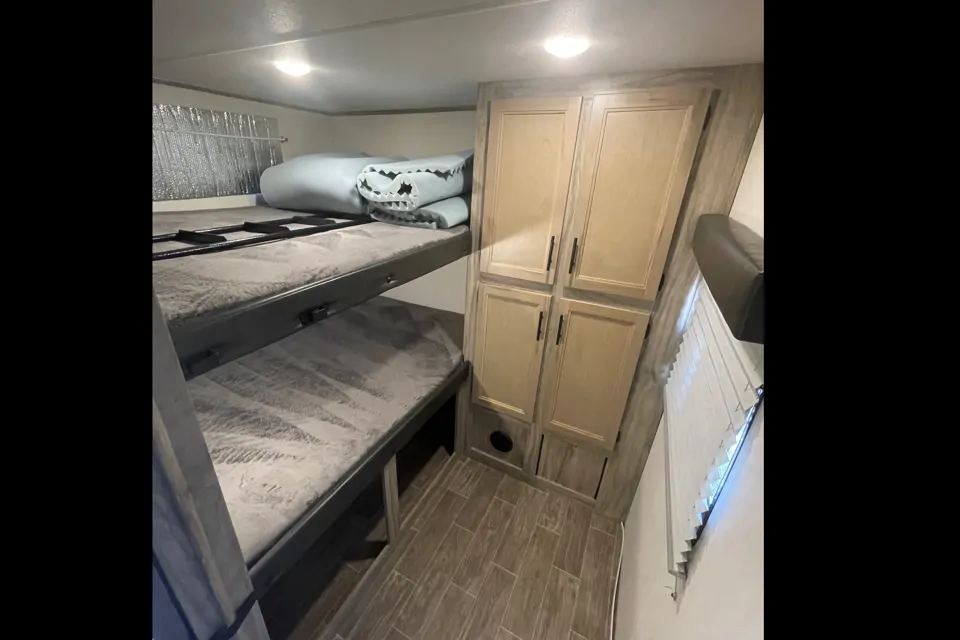 The Cherokee Alpha Wolf boasts a spacious interior layout that includes a large living area, fully equipped kitchen with stovetop and oven that have never been used, and comfortable sleeping accommodations including a master bedroom with new upgrades including a Sealy mattress w/ topper. Double bunks also include new toppers. With its modern design and high-quality materials, this travel trailer provides a relaxing and welcoming atmosphere for travelers.