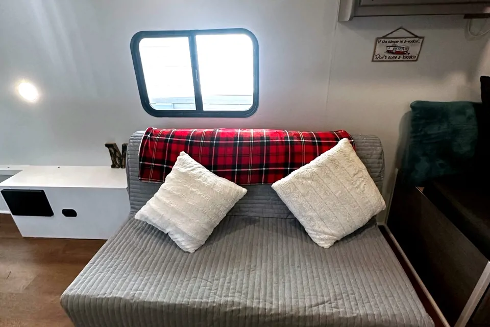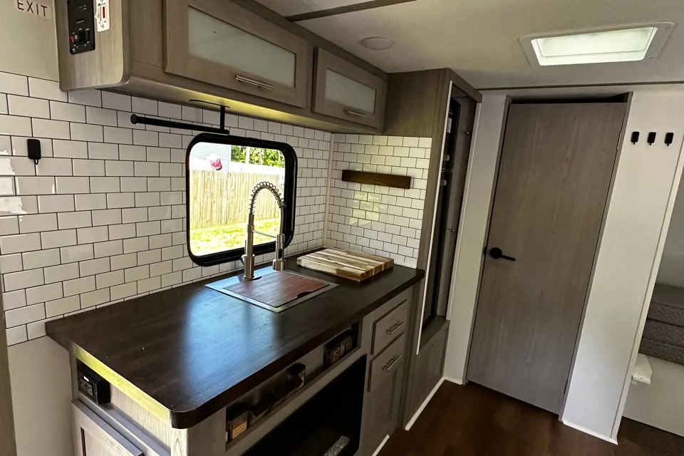 2022 Coleman Lantern 17b travel trailer. This awesome trailer was fully renovated in January 2023 to increase the usability of the space and comfort. All aesthetics were upgraded to finishes that feel just like home. Butcher block counters, deep stainless sink and faucet, custom seats over storage compartments, additional counter area, TV mount, Ikea convertible couch/queen size bed. This trailer is the perfect getaway vehicle for a couple but can also include a custom bed insert to increase the capacity to 3. This camper has more open floor space than any other camper its size, get ready for your vacation of comfort!