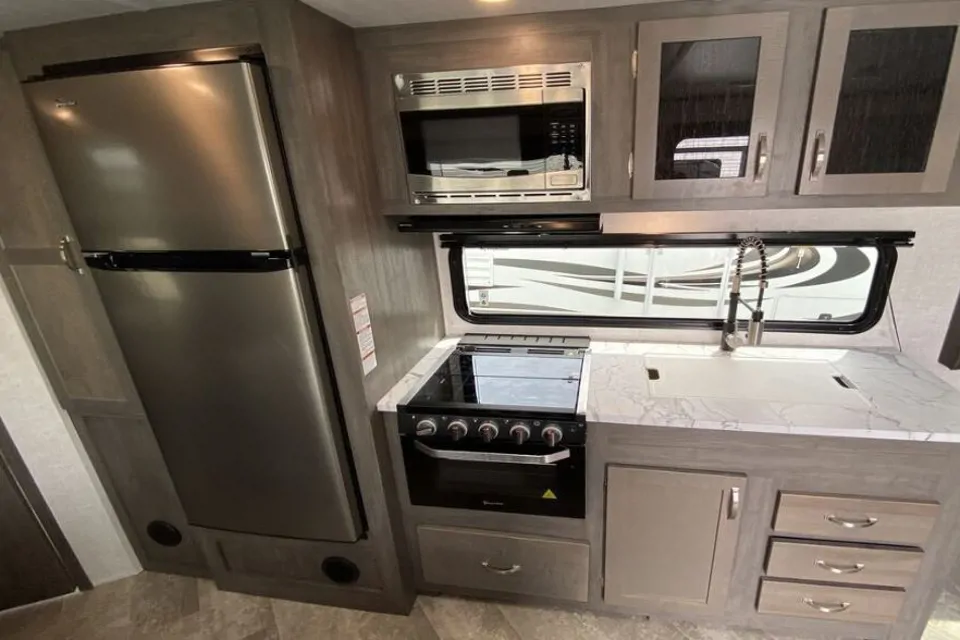 Brand new trailer sleeps 6 comfortably. Has a great layout for families or couples. The stylish Murphy bed creates extra living space and easily converts to a queen bed for nighttime. Double-sized bunk beds are great for kids and the dinette also converts to a large bed if needed. The kitchen sink converts to a counter for extra food prep space and the outdoor kitchen component includes a propane griddle and a mini-fridge so you can get your cold drinks without going in and out of the trailer. Inside there is a large fridge and separate freezer to keep all your food and treats.