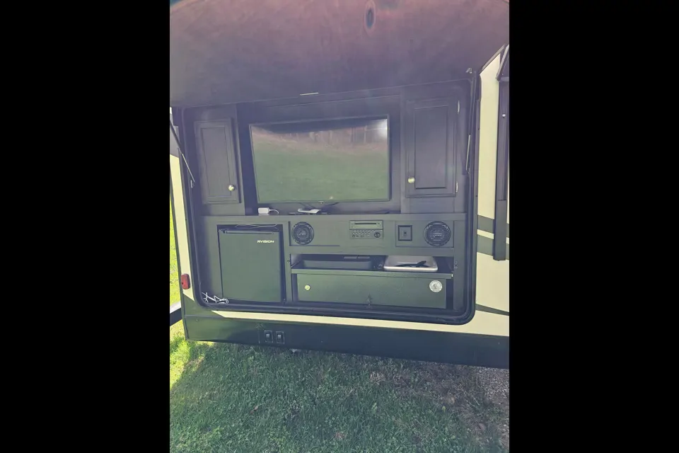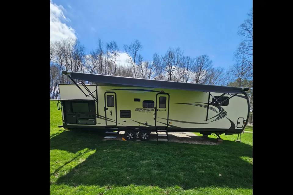 Discover the gorgeous campgrounds around Mohican, Ohio area. We deliver and set up the camper when you make a reservation at your preferred campground in Mohican area. Sleeps 6 people with 2 bunk beds in the back bedroom and a master bedroom in the front with a fire place. An additional fireplace in the living room. This camper has a TV, stove, microwave, and oven. 1/2 bath accessible from the outside. With a convenient outdoor kitchen and TV. There will be 4 camping chairs, hotdog sticks, coffee pot, glassware, and cooking essentials to help with your experience. This is perfect for families or couples.