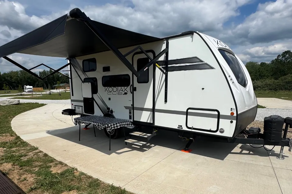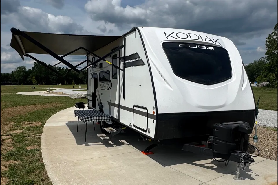 Enjoy some camping in this beautiful new travel trailer. Our camper is great for a quick easy getaway. It comes with all of the basic needs to get you camping. The leveling jack are easy to use with the push of a button. 30 amp electric hookup. Water and sewer are very simple to set up. Our camper will sleep 5. Two in the queen bed, the dinette will accommodate one, and there are two bunks in the back. Modern kitchen and bathroom. They’re on the smaller side but are fully functional. It does have an electric awning and led outside lighting. Air conditioning as well as heat.