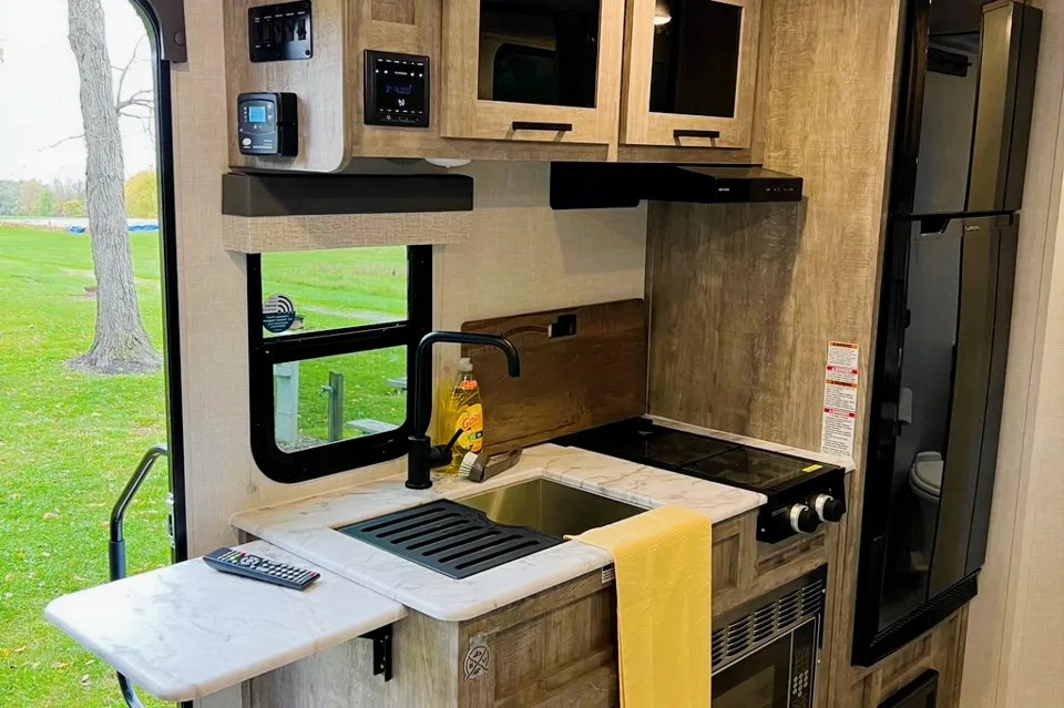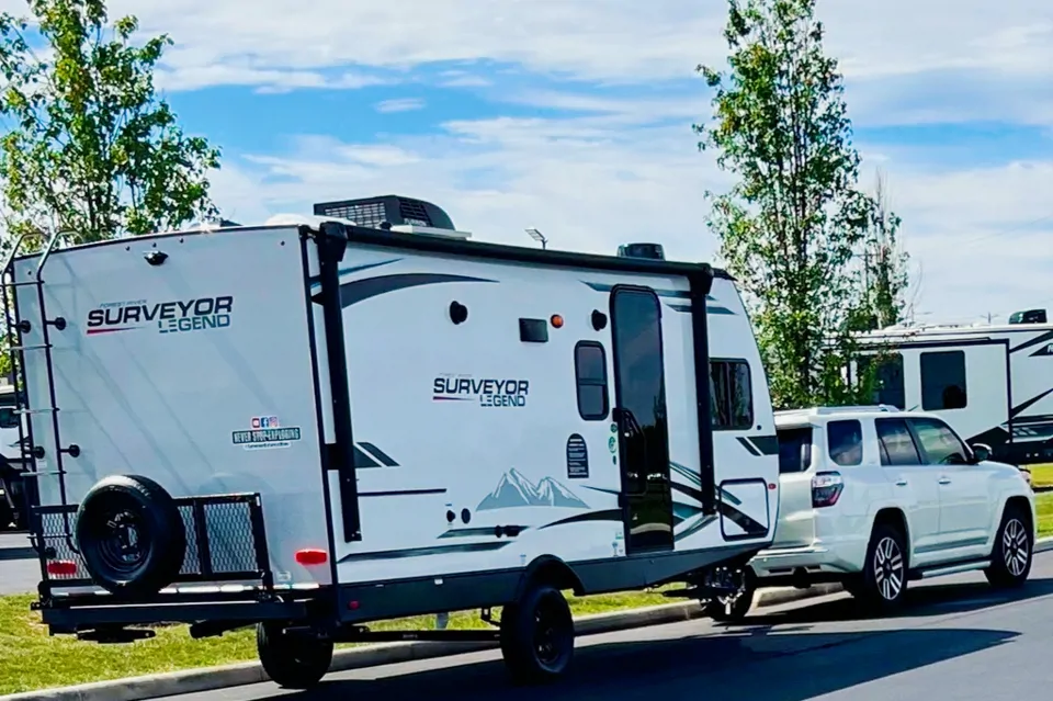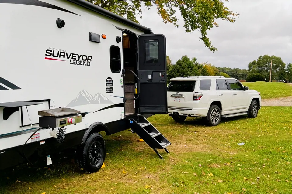Our Camper Sleeps up to 6 guests and need a tow vehicle rated 4700 lbs or more. Whether you are inside enjoying a cold drink from our residential refrigerator or just starting a meal on the two burner propane ready cooking stove, we’ve got you covered with a midnight frost view featuring a huge sink and versatile convection microwave oven. Our teddy bear adult size bunks, deep dinette slide-out which converts to a bed, large washroom with extra storage, HD television, and a 60x80 queen bed nestled under a “Stargazer” front window offer much needed convenience. Outside, enjoy your music on our built in blue lit speakers under a 15 ft awning with porch and led lights or under the night sky. Grab the griddle, prep shelf, spray port and have breakfast ready or clean up outside. This is how we camp and we hope you will too with our brand new Surveyor Legend!