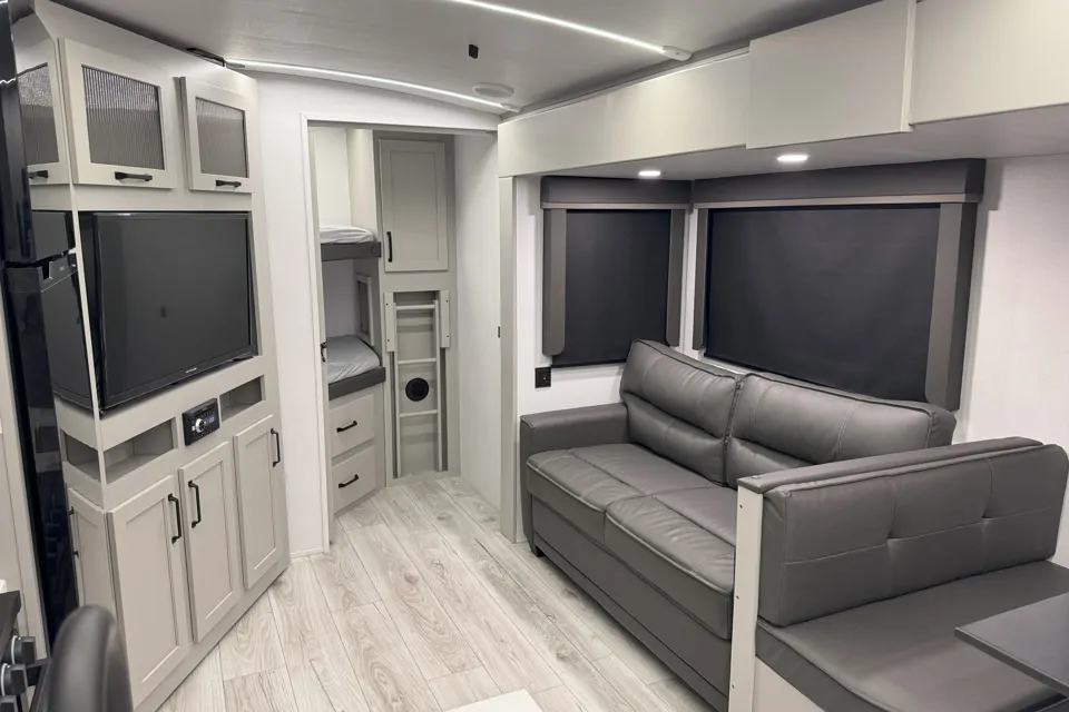 The bunkhouse is great for families and can easily sleep four younger children or a couple of teenagers. The living area has a comfy couch and a dinette with seating for four. Both convert to more sleeping spots if needed.