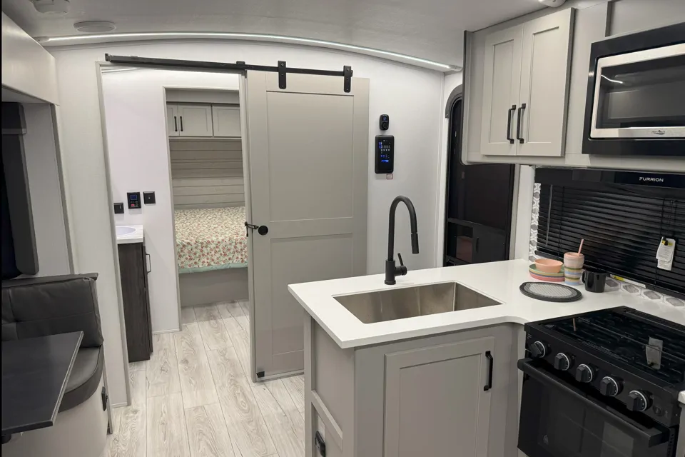 All of your cooking needs are met with a spacious indoor kitchen complete with microwave, range and oven. A 12V interior refrigerator/freezer can be packed before you leave and provides ample space for everything you'll need on your trip. Basic kitchen supplies are provided.