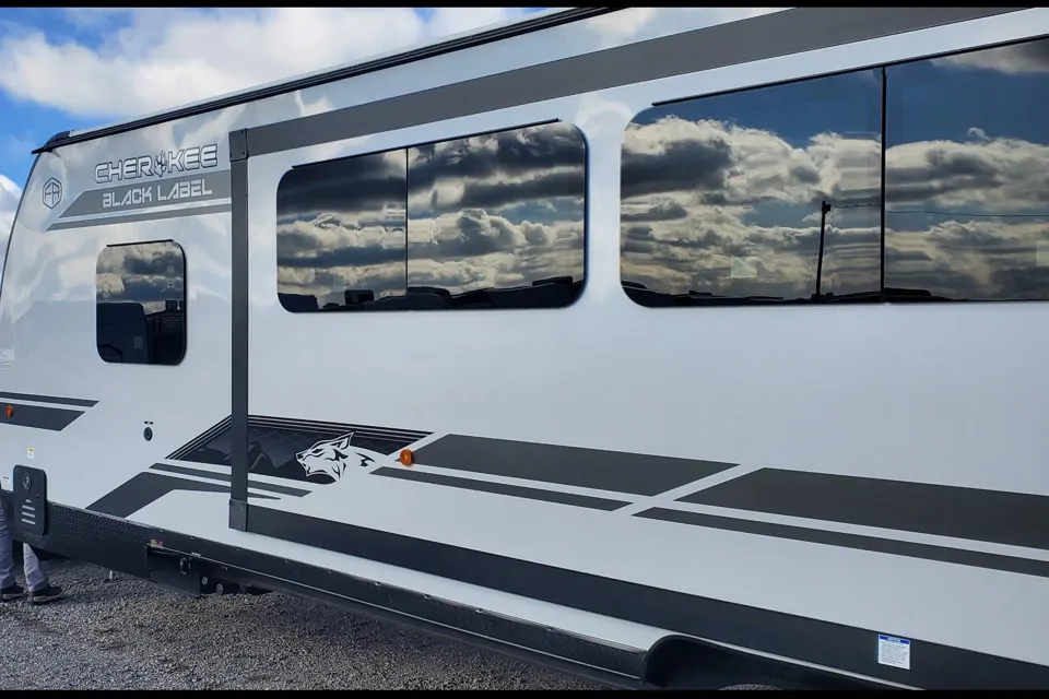 And because it’s Black Label, you’re getting a more premium finish package, including fiberglass gel-coat sided walls, frameless windows, thermo-foil arctic insulation, upgraded solid-surface countertops, upgraded reading lights, and designer cushion fabric.