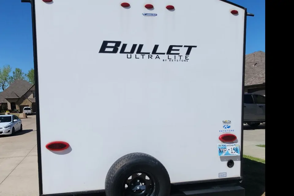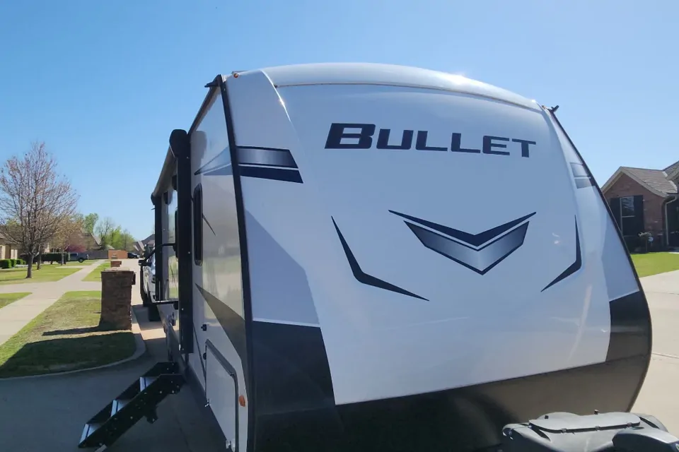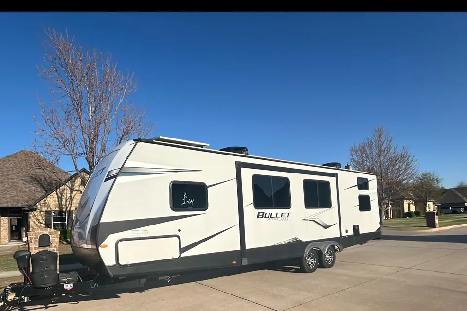 The exterior is equipped with an outdoor kitchen and mini fridge, a shower, solar panels and extra storage on both end of the camper.